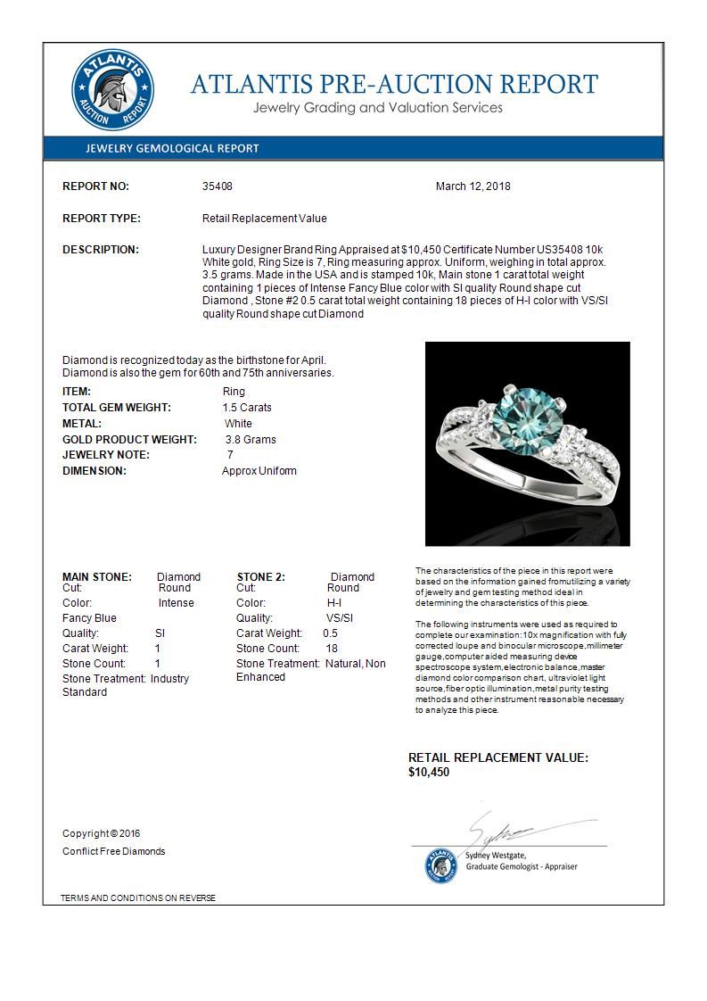 REF-172A8X -35408 ---- 1.5 CTW Si Certified Fancy Blue Diamond 3 Stone Ring 10K White Gold ---- Luxury Designer Brand Ring Appraised at $10,450 Certificate Number US35408 10k White gold, Ring Size is 7, Ring measuring approx. Uniform, weighing in total approx. 3.5 grams. Made in the USA and is stamped 10k, Main stone 1 carat total weight containing 1 pieces of Intense Fancy Blue color with SI quality Round shape cut Diamond , Stone #2 0.5 carat total weight containing 18 pieces of H-I color with VS/SI quality Round shape cut Diamond
