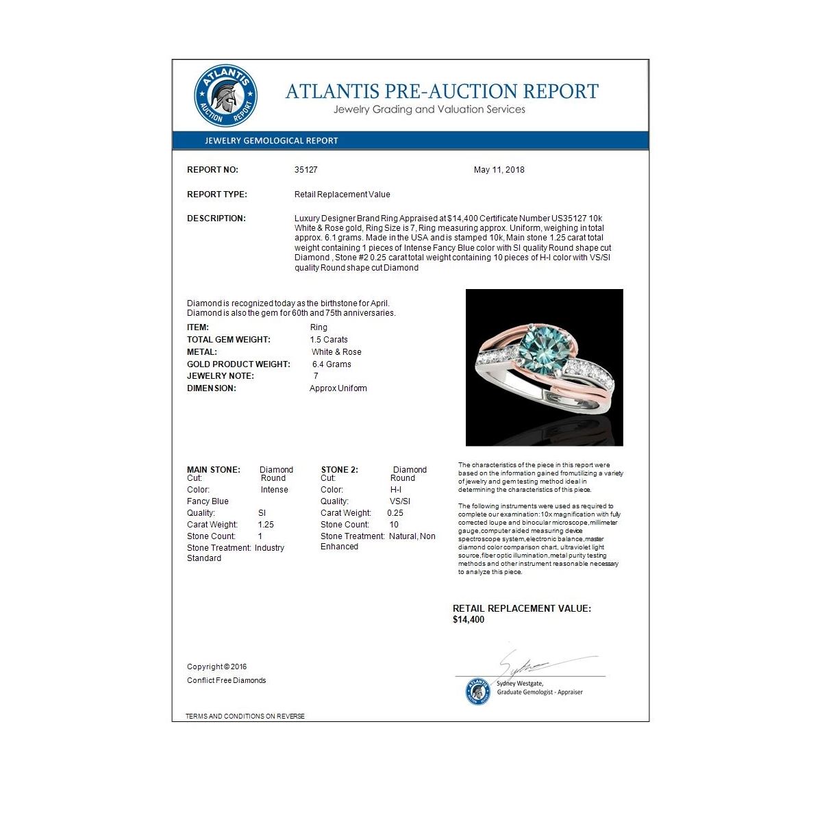 REF-218Y2K -35127 ---- 1.5 CTW Si Certified Fancy Blue Diamond Bypass Solitaire Ring 10K White & Rose Gold ---- Luxury Designer Brand Ring Appraised at $14,400 Certificate Number US35127 10k White & Rose gold, Ring Size is 7, Ring measuring approx. Uniform, weighing in total approx. 6.1 grams. Made in the USA and is stamped 10k, Main stone 1.25 carat total weight containing 1 pieces of Intense Fancy Blue color with SI quality Round shape cut Diamond , Stone #2 0.25 carat total weight containing 10 pieces of H-I color with VS/SI quality Round shape cut Diamond