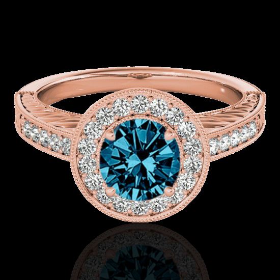 REF-200F2N -33748 ---- 1.5 CTW Si Certified Fancy Blue Diamond Solitaire Halo Ring 10K Rose Gold ---- Luxury Designer Brand Ring Appraised at $12,100 Certificate Number US33748 10k Rose gold, Ring Size is 7, Ring measuring approx. Uniform, weighing in total approx. 6.4 grams. Made in the USA and is stamped 10k, Main stone 1.14 carat total weight containing 1 pieces of Intense Fancy Blue color with SI quality Round shape cut Diamond , Stone #2 0.36 carat total weight containing 31 pieces of H-I color with VS/SI quality Round shape cut Diamond
