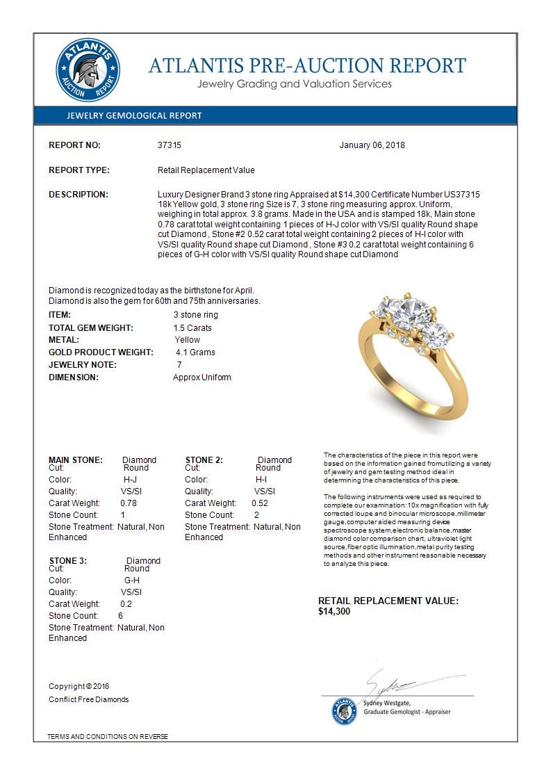 REF-236X4T -37315 ---- 1.5 CTW VS/SI Diamond Solitaire Art Deco 3 Stone Ring 18K Yellow Gold ---- Luxury Designer Brand 3 stone ring Appraised at $14,300 Certificate Number US37315 18k Yellow gold, 3 stone ring Size is 7, 3 stone ring measuring approx. Uniform, weighing in total approx. 3.8 grams. Made in the USA and is stamped 18k, Main stone 0.78 carat total weight containing 1 pieces of H-J color with VS/SI quality Round shape cut Diamond , Stone #2 0.52 carat total weight containing 2 pieces of H-I color with VS/SI quality Round shape cut Diamond , Stone #3 0.2 carat total weight containing 6 pieces of G-H color with VS/SI quality Round shape cut Diamond