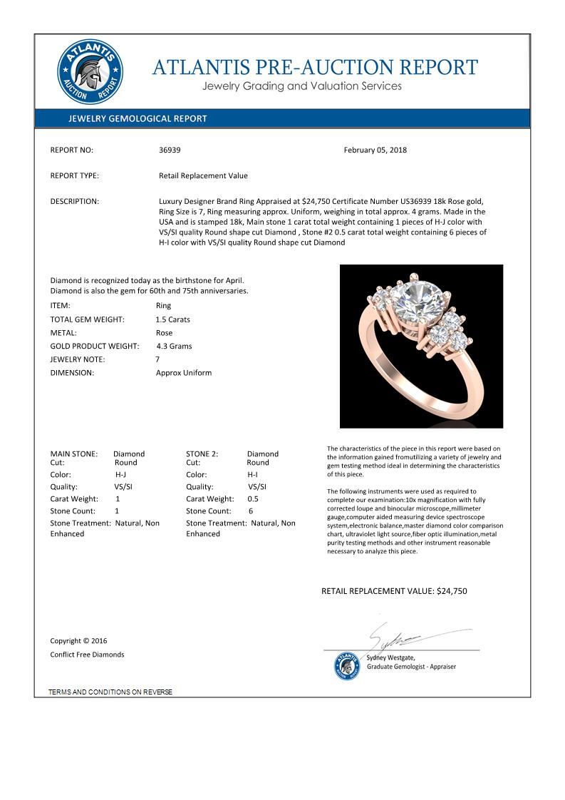 REF-409N3Y -36939 ---- 1.5 CTW VS/SI Diamond Solitaire Ring 18K Rose Gold ---- Luxury Designer Brand Ring Appraised at $24,750 Certificate Number US36939 18k Rose gold, Ring Size is 7, Ring measuring approx. Uniform, weighing in total approx. 4 grams. Made in the USA and is stamped 18k, Main stone 1 carat total weight containing 1 pieces of H-J color with VS/SI quality Round shape cut Diamond , Stone #2 0.5 carat total weight containing 6 pieces of H-I color with VS/SI quality Round shape cut Diamond