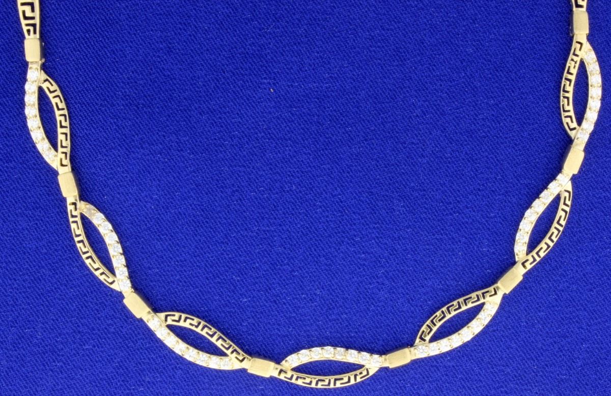 There are 56 brilliant cut diamonds. Clarity SI and G-H color. 18" in length. The necklace is 7.5mm wide at widest point. 17.1g