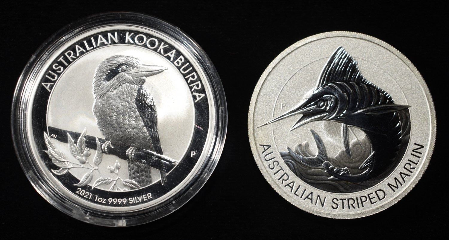 1 OZ .999 SILVER KOOKABURRA PROOF & 1.5 OZ .999 SILVER MARLIN REVERSE PROOF ESTIMATE $190 - $240.