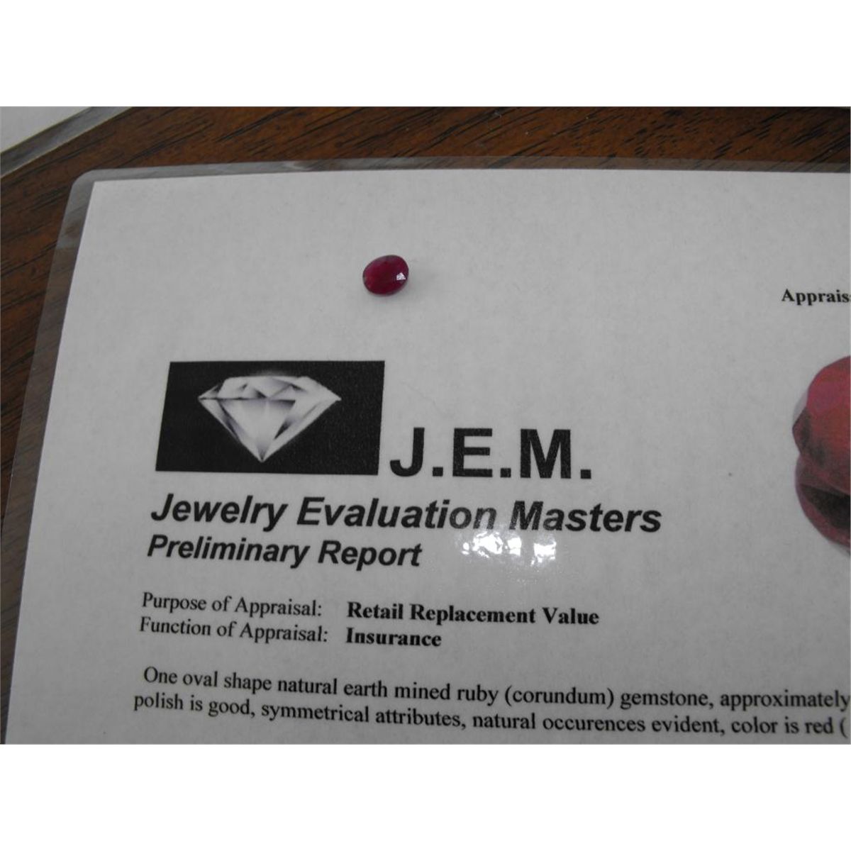 An earth mined natural gemstone. utilizes Preliminary Report Appraisals, which are the most common. These types of evaluations are written for insurance needs. This would be the cost to replace the jewelry with an item of equal qualityand kind, considered to be the current market price in the region specified, or the replacement value. of such an item in the region noted. This type of appraisal is done to protect you in the event of damage or loss. Preliminary Reportappraisals are conducted by an independent 3rd Party appraisal firm that utilizes Certified GIA Graduate Gemologistd. Jemvalues.com Appraisals should be used for verification of gemstone and/or metal weight, size, and gradeonly, not actual value. Appraisal value should be considered for insurance purposes only, not actual value, as price varies greatly from retail locations thru out the world. Items should not be purchased with the expectation to resell forappraisal price, or for profit. All sales are final with no returns or discounts. Use due diligence prior to bidding. One should not bid if unsure