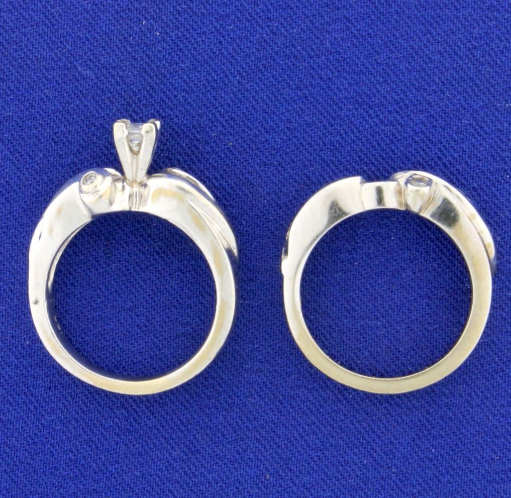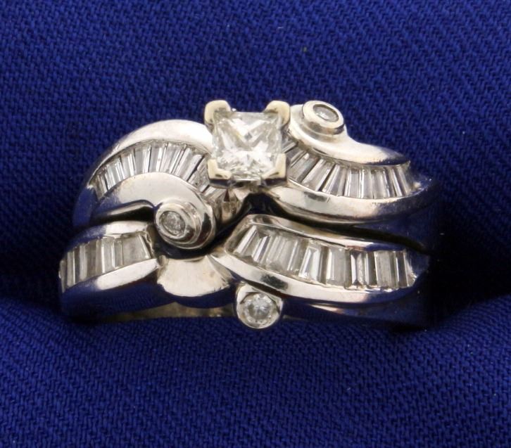 In 14k White Gold. Engagement ring contains a high quality 1/3 ct princess cut diamond. H color SI clarity. The ring also contains an additional 2/3 ct TW high quality baguette and round diamonds, H color SI clarity. Band contains 1/2 ct of high quality baguette and round diamonds of similar quality. Very unique and beautiful style. Size 7. 12.8g