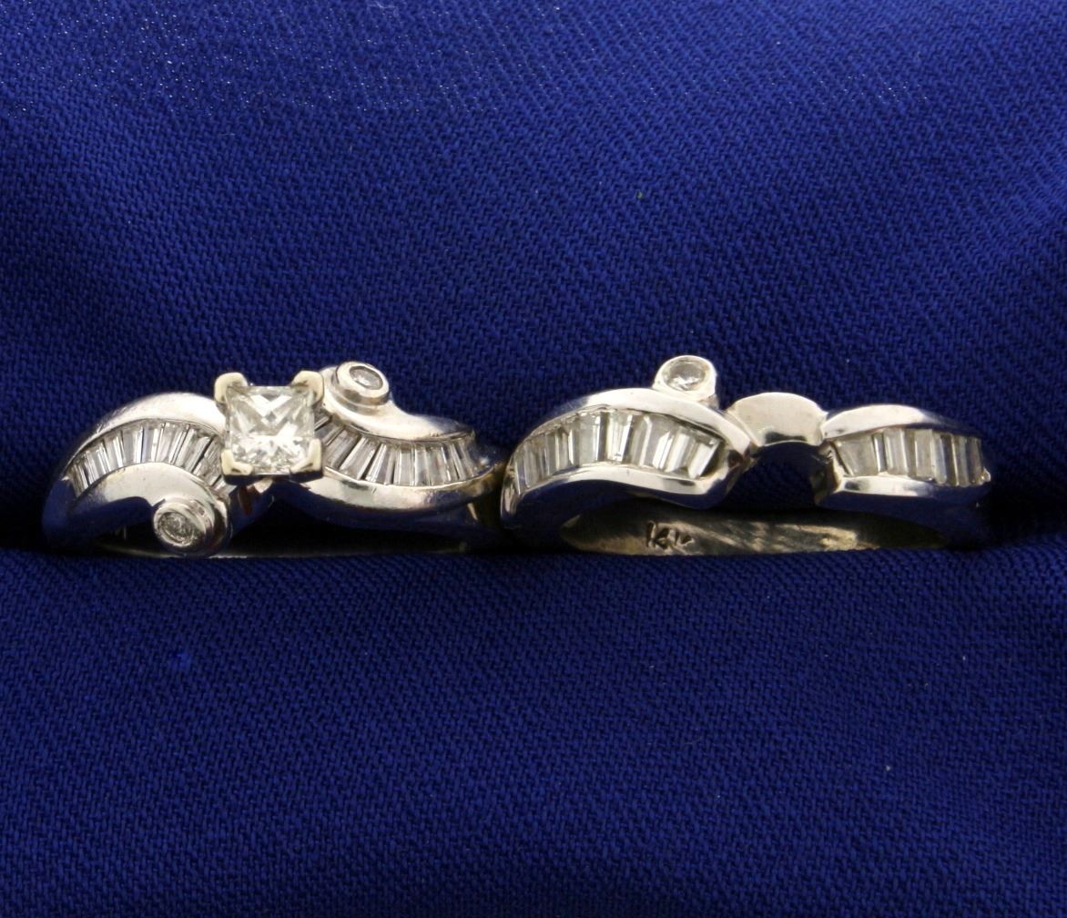 In 14k White Gold. Engagement ring contains a high quality 1/3 ct princess cut diamond. H color SI clarity. The ring also contains an additional 2/3 ct TW high quality baguette and round diamonds, H color SI clarity. Band contains 1/2 ct of high quality baguette and round diamonds of similar quality. Very unique and beautiful style. Size 7. 12.8g