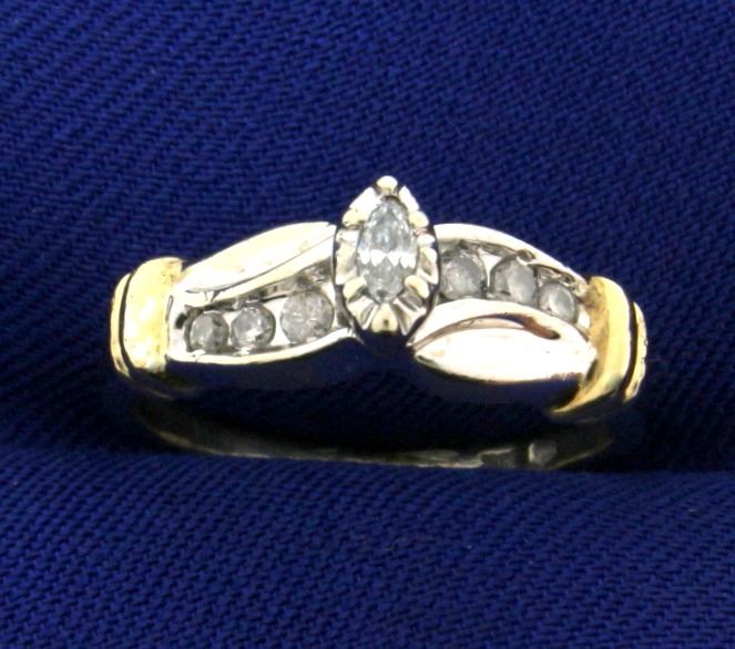 In 10k white and yellow gold. Contains .2 ct of high quality marquise and round brilliant diamonds - SI to I clarity/I color. Size 5. 3.2g