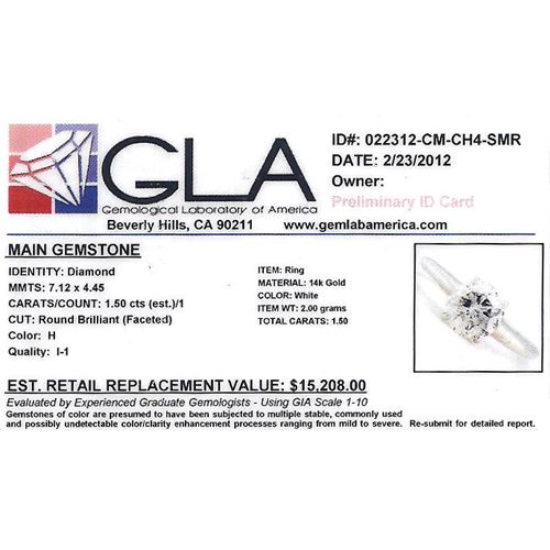1.5 ctw Certified Diamond 14k Solitaire Ring H I-1 **|**|**  ; MSRP: $15208