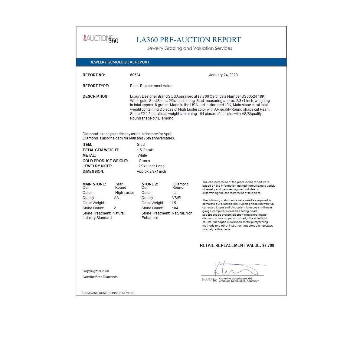 All sales are final, placing a bid is a legally binding obligation. All lots are sold as is, where is, with all the faults, imperfections, omissions and errors in the written description, estimates, appraisals, graphics and photography. USJL is not responsible for any errors or omissions in the description, graphics or photography provided or in the bidding software. Due diligence to verify the condition and description of a lot is the sole responsibility of the Bidder prior to placing any bid. Returns may only be made with the advance written authorization of USJL and are in USJL's sole discretion to approve. To request a return you must provide a written request fully explaining the basis for the return no later than 4 days after your receipt of the lot. Under no circumstances will any amounts other than the winning bid amount be refunded. A restocking charge of 19% of the full invoice amount may apply in USJL 's sole discretion. Any allowed returns must be received in exactly the same condition as when originally shipped to Buyer, or they will be returned to buyer at Buyer's cost. Any unauthorized returns will be refused. DELIVERY REFUSAL OF ITEMS SHIPPED BY US JEWELRY LIQUIDATION TO THE BIDDER CONSTITUTES AN UNAUTHORIZED RETURN IN DIRECT VIOLATION OF THESE GENERAL TERMS AND CONDITIONS.