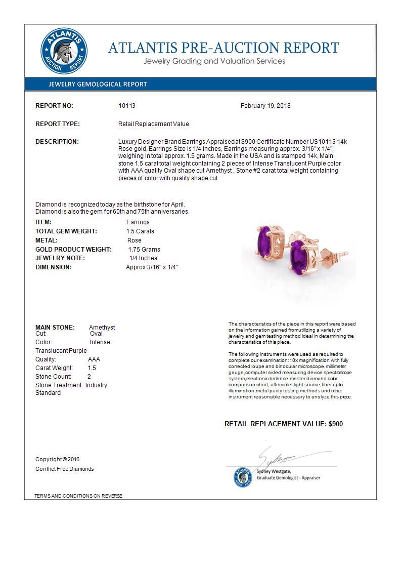 REF-13K5W -10113 ---- 1.50 CTW Amethyst Earrings 14K Rose Gold ---- Luxury Designer Brand Earrings Appraised at $900 Certificate Number US10113 14k Rose gold, Earrings Size is 1/4 Inches, Earrings measuring approx. 3/16" x 1/4", weighing in total approx. 1.5 grams. Made in the USA and is stamped 14k, Main stone 1.5 carat total weight containing 2 pieces of Intense Translucent Purple color with AAA quality Oval shape cut Amethyst , Stone #2 carat total weight containing pieces of color with quality shape cut