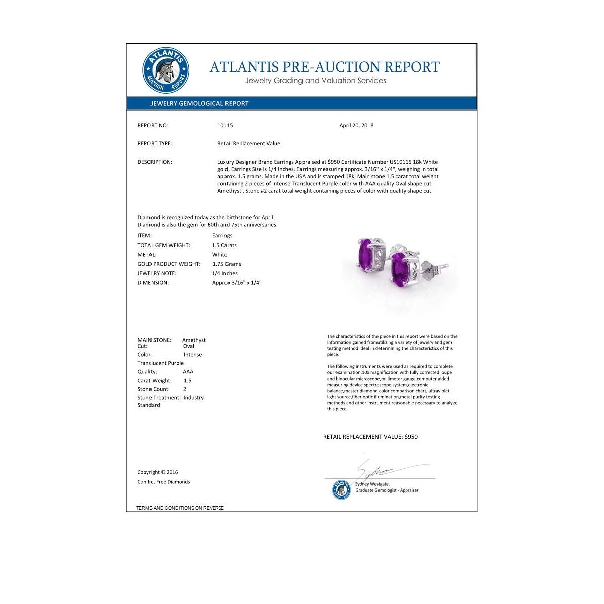 REF-14M2H -10115 ---- 1.50 CTW Amethyst Earrings 18K White Gold ---- Luxury Designer Brand Earrings Appraised at $950 Certificate Number US10115 18k White gold, Earrings Size is 1/4 Inches, Earrings measuring approx. 3/16" x 1/4", weighing in total approx. 1.5 grams. Made in the USA and is stamped 18k, Main stone 1.5 carat total weight containing 2 pieces of Intense Translucent Purple color with AAA quality Oval shape cut Amethyst , Stone #2 carat total weight containing pieces of color with quality shape cut