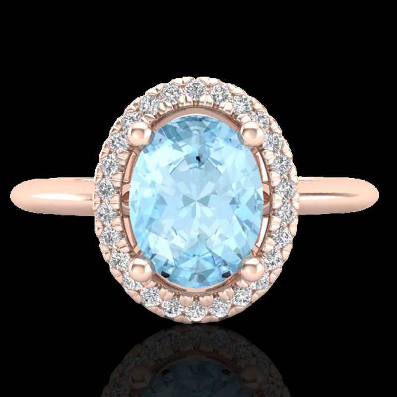 1.50 CTW Aquamarine & Micro VS/SI Diamond Ring Solitaire Halo 14K Rose Gold ---- Luxury Designer Brand Ring Appraised Retail Price at $3,400 ---- SKU Number US21000 14k Rose gold Ring Size is 7, Ring measuring approx. 1/2" X 1/2" , weighing in total approx. 3.5 grams. Made in the USA and is stamped 14k, Main stone 1.27 carat total weight containing 1 pieces of Translucent Medium Blue color with AAA quality Oval shape cut Aquamarine , Stone #2 0.23 carat total weight containing 27 pieces of H-I color with VS/SI quality Round shape cut