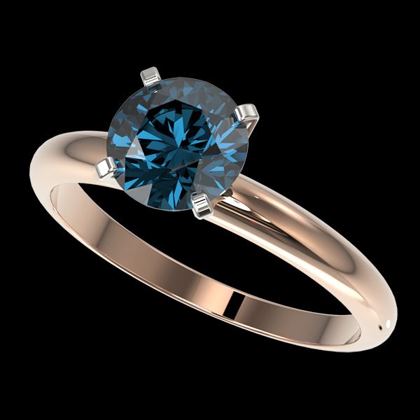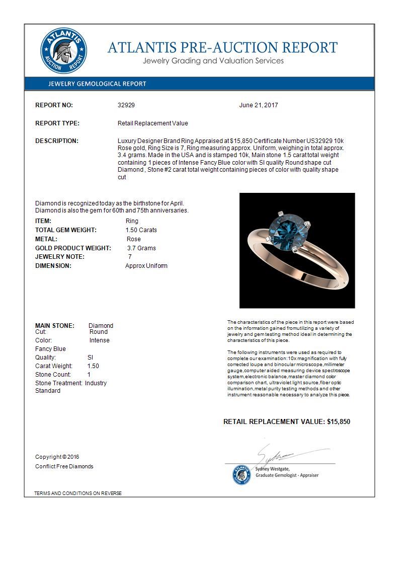 1.50 CTW Certified Intense Blue SI Diamond Solitaire Engagement Ring 10K Rose Gold ---- Luxury Designer Brand Ring Appraised Retail Price at $15,850 ---- SKU Number US32929 10k Rose gold Ring Size is 7, Ring measuring approx. Uniform, weighing in total approx. 3.4 grams. Made in the USA and is stamped 10k, Main stone 1.50 carat total weight containing 1 pieces of Intense Fancy Blue color with SI quality Round shape cut Diamond , Stone #2 carat total weight containing pieces of color with quality shape cut