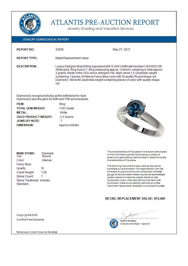 1.50 CTW Certified Intense Blue SI Diamond Solitaire Engagement Ring 10K White Gold ---- Luxury Designer Brand Ring Appraised Retail Price at $15,400 ---- SKU Number US33025 10k White gold Ring Size is 7, Ring measuring approx. Uniform, weighing in total approx. 3 grams. Made in the USA and is stamped 10k, Main stone 1.50 carat total weight containing 1 pieces of Intense Fancy Blue color with SI quality Round shape cut Diamond , Stone #2 carat total weight containing pieces of color with quality shape cut