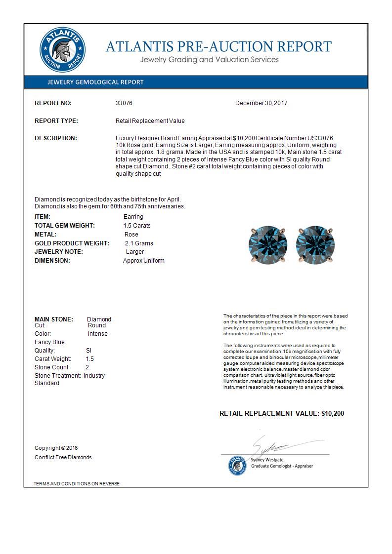 REF-127H5A -33076 ---- 1.50 CTW Certified Intense Blue SI Diamond Solitaire Stud Earrings 10K Rose Gold ---- Luxury Designer Brand Earring Appraised at $10,200 Certificate Number US33076  10k Rose gold,  Earring Size is Larger, Earring measuring approx. Uniform, weighing in total approx. 1.8 grams. Made in the USA and is stamped 10k, Main stone 1.5 carat total weight containing 2 pieces of Intense Fancy Blue color with SI  quality Round shape cut Diamond , Stone #2  carat total weight containing  pieces of  color with quality  shape cut