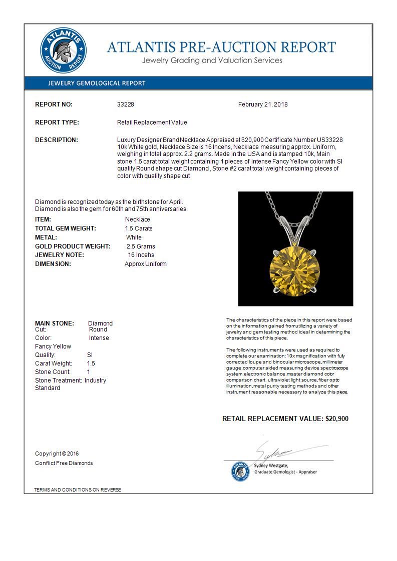 REF-285X2T -33228 ---- 1.50 CTW Certified Intense Yellow SI Diamond Solitaire Necklace 10K White Gold ---- Luxury Designer Brand Necklace Appraised at $20,900 Certificate Number US33228 10k White gold, Necklace Size is 16 Incehs, Necklace measuring approx. Uniform, weighing in total approx. 2.2 grams. Made in the USA and is stamped 10k, Main stone 1.5 carat total weight containing 1 pieces of Intense Fancy Yellow color with SI quality Round shape cut Diamond , Stone #2 carat total weight containing pieces of color with quality shape cut