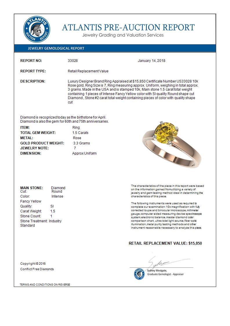 REF-216H3A -33028 ---- 1.50 CTW Certified Intense Yellow SI Diamond Solitaire Ring 10K Rose Gold ---- Luxury Designer Brand Ring Appraised at $15,850 Certificate Number US33028 10k Rose gold, Ring Size is 7, Ring measuring approx. Uniform, weighing in total approx. 3 grams. Made in the USA and is stamped 10k, Main stone 1.5 carat total weight containing 1 pieces of Intense Fancy Yellow color with SI quality Round shape cut Diamond , Stone #2 carat total weight containing pieces of color with quality shape cut