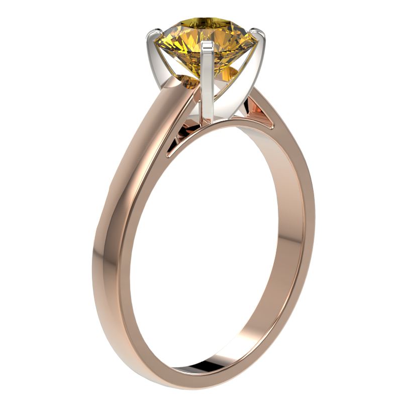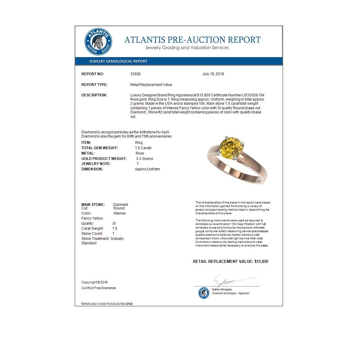 REF-216H3A -33028 ---- 1.50 CTW Certified Intense Yellow SI Diamond Solitaire Ring 10K Rose Gold ---- Luxury Designer Brand Ring Appraised at $15,850 Certificate Number US33028 10k Rose gold, Ring Size is 7, Ring measuring approx. Uniform, weighing in total approx. 3 grams. Made in the USA and is stamped 10k, Main stone 1.5 carat total weight containing 1 pieces of Intense Fancy Yellow color with SI quality Round shape cut Diamond , Stone #2 carat total weight containing pieces of color with quality shape cut