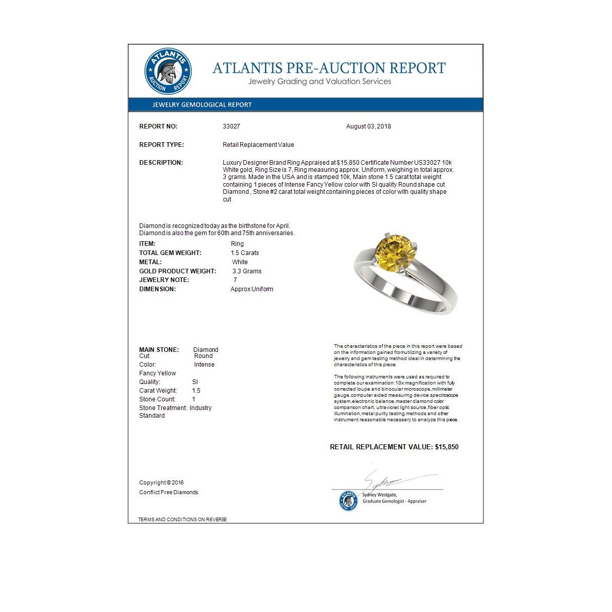 REF-216X3T -33027 ---- 1.50 CTW Certified Intense Yellow SI Diamond Solitaire Ring 10K White Gold ---- Luxury Designer Brand Ring Appraised at $15,850 Certificate Number US33027 10k White gold, Ring Size is 7, Ring measuring approx. Uniform, weighing in total approx. 3 grams. Made in the USA and is stamped 10k, Main stone 1.5 carat total weight containing 1 pieces of Intense Fancy Yellow color with SI quality Round shape cut Diamond , Stone #2 carat total weight containing pieces of color with quality shape cut
