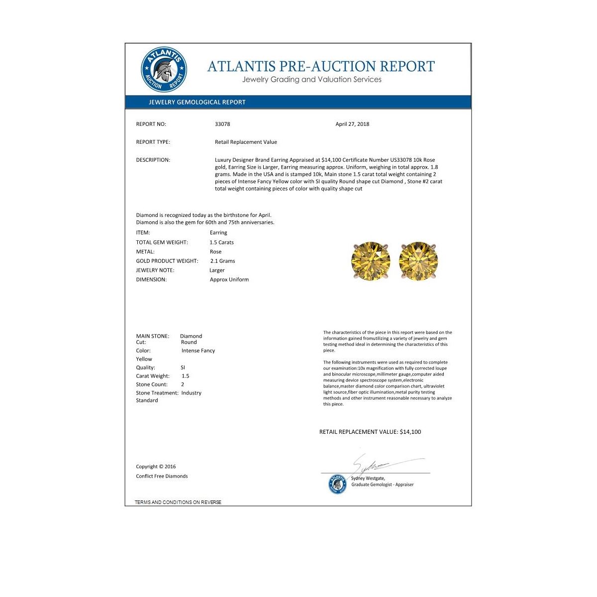 REF-192X2T -33078 ---- 1.50 CTW Certified Intense Yellow SI Diamond Solitaire Stud Earrings 10K Rose Gold ---- Luxury Designer Brand Earring Appraised at $14,100 Certificate Number US33078 10k Rose gold, Earring Size is Larger, Earring measuring approx. Uniform, weighing in total approx. 1.8 grams. Made in the USA and is stamped 10k, Main stone 1.5 carat total weight containing 2 pieces of Intense Fancy Yellow color with SI quality Round shape cut Diamond , Stone #2 carat total weight containing pieces of color with quality shape cut