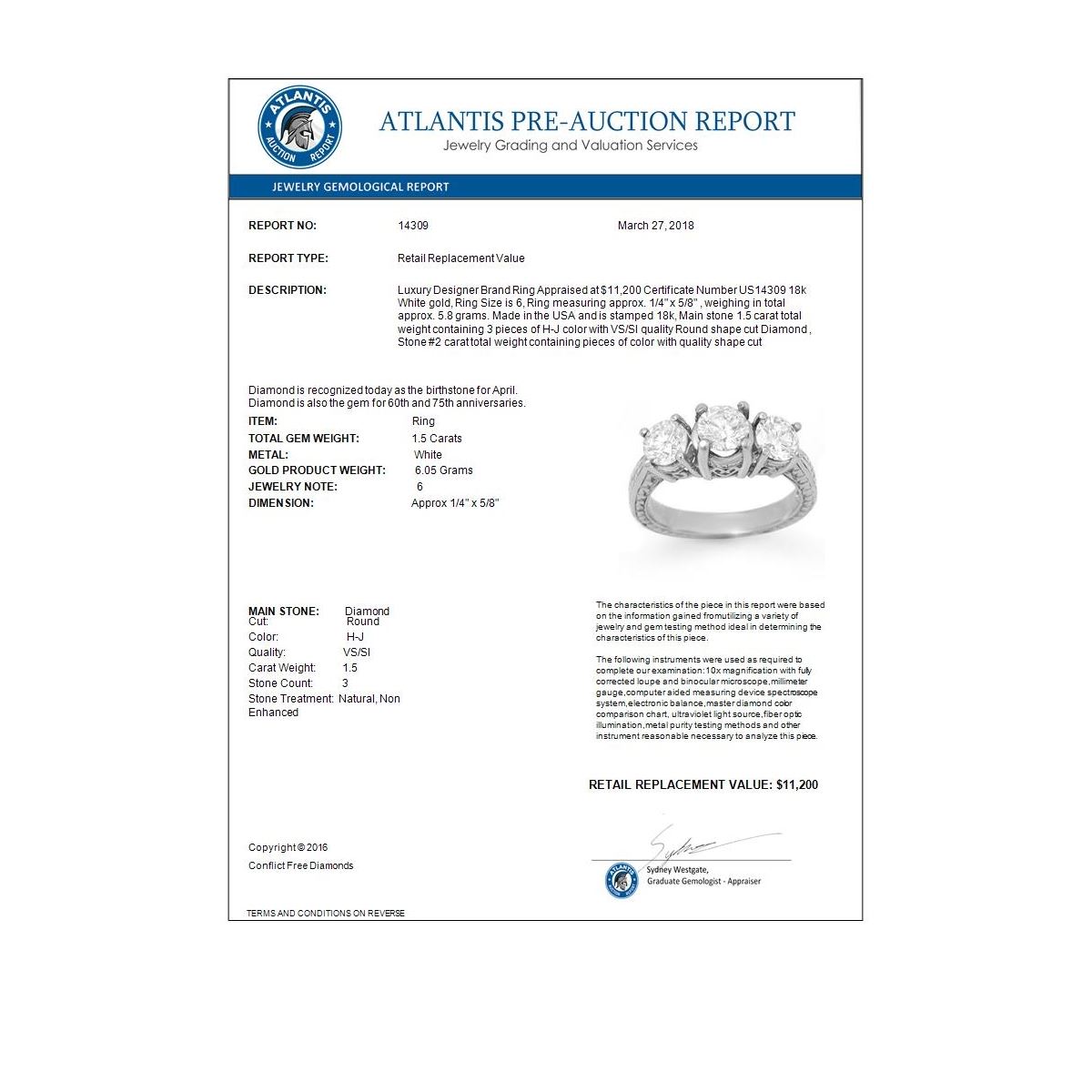 REF-255W3F -14309 ---- 1.50 CTW Certified VS/SI Diamond 3 Stone Ring 18K White Gold ---- Luxury Designer Brand Ring Appraised at $11,200 Certificate Number US14309 18k White gold, Ring Size is 6, Ring measuring approx. 1/4" x 5/8" , weighing in total approx. 5.8 grams. Made in the USA and is stamped 18k, Main stone 1.5 carat total weight containing 3 pieces of H-J color with VS/SI quality Round shape cut Diamond , Stone #2 carat total weight containing pieces of color with quality shape cut
