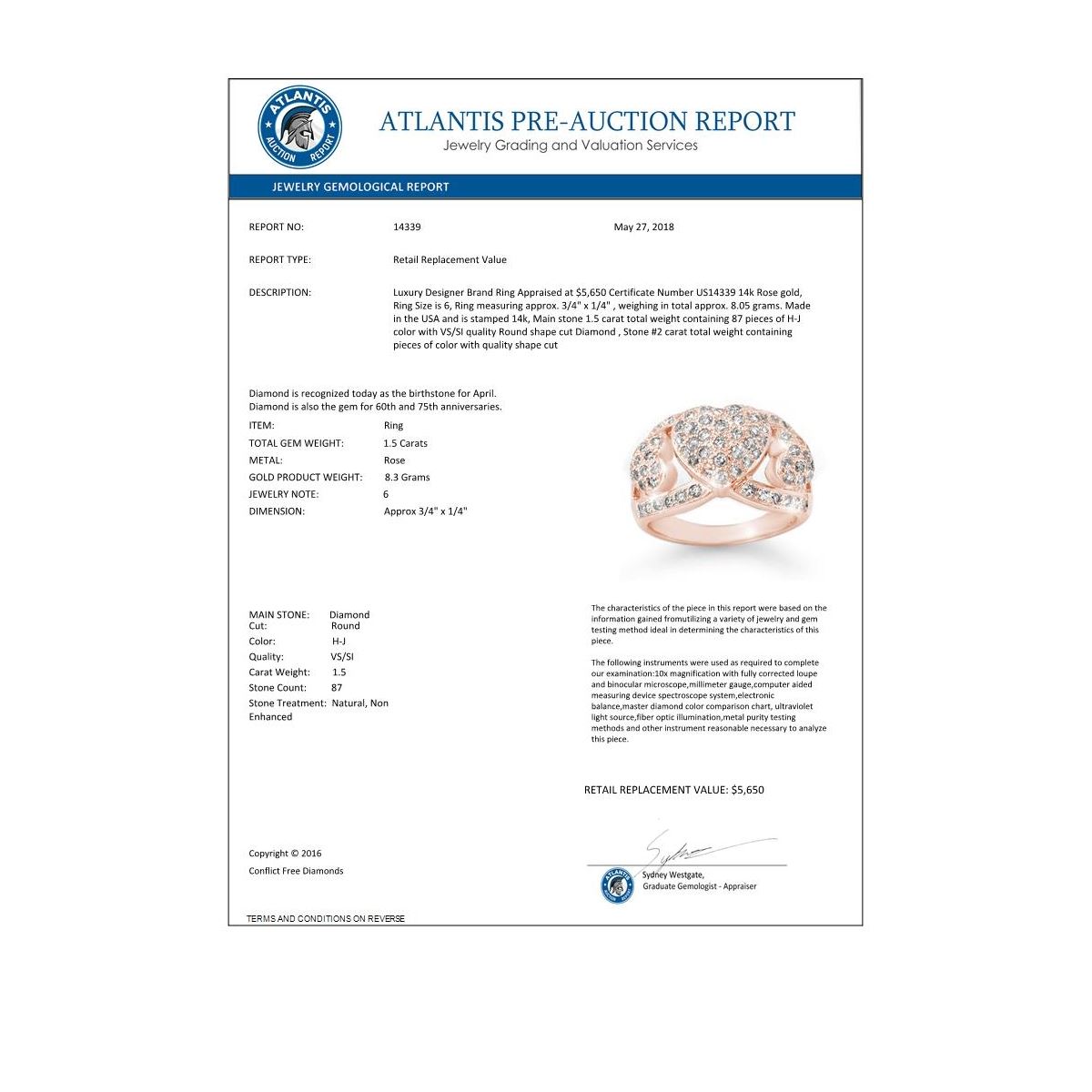 REF-128W9F -14339 ---- 1.50 CTW Certified VS/SI Diamond Ring 14K Rose Gold ---- Luxury Designer Brand Ring Appraised at $5,650 Certificate Number US14339 14k Rose gold, Ring Size is 6, Ring measuring approx. 3/4" x 1/4" , weighing in total approx. 8.05 grams. Made in the USA and is stamped 14k, Main stone 1.5 carat total weight containing 87 pieces of H-J color with VS/SI quality Round shape cut Diamond , Stone #2 carat total weight containing pieces of color with quality shape cut
