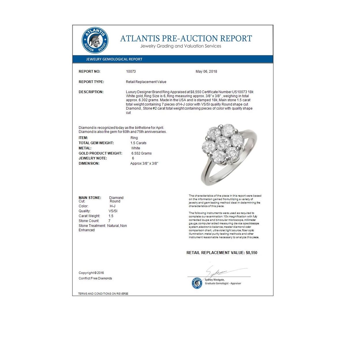 REF-194W8F -10073 ---- 1.50 CTW Certified VS/SI Diamond Ring 18K White Gold ---- Luxury Designer Brand Ring Appraised at $8,550 Certificate Number US10073 18k White gold, Ring Size is 6, Ring measuring approx. 3/8" x 3/8" , weighing in total approx. 6.302 grams. Made in the USA and is stamped 18k, Main stone 1.5 carat total weight containing 7 pieces of H-J color with VS/SI quality Round shape cut Diamond , Stone #2 carat total weight containing pieces of color with quality shape cut