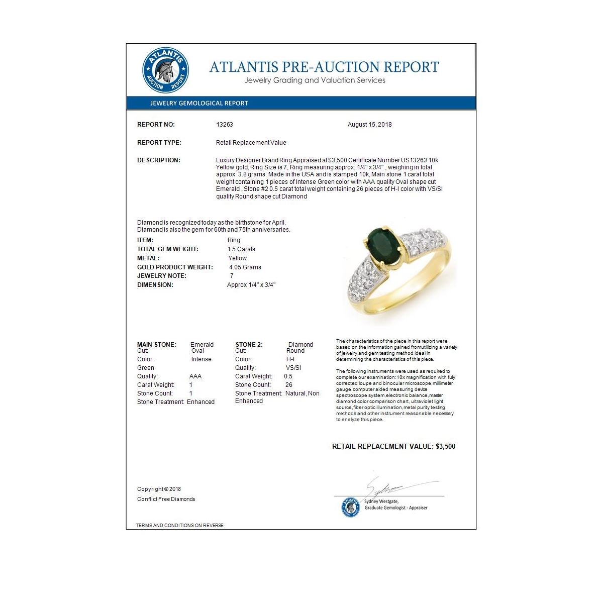 REF-52H8A -13263 ---- 1.50 CTW Emerald & Diamond Ring 10K Yellow Gold ---- Luxury Designer Brand Ring Appraised at $3,500 Certificate Number US13263 10k Yellow gold, Ring Size is 7, Ring measuring approx. 1/4" x 3/4" , weighing in total approx. 3.8 grams. Made in the USA and is stamped 10k, Main stone 1 carat total weight containing 1 pieces of Intense Green color with AAA quality Oval shape cut Emerald , Stone #2 0.5 carat total weight containing 26 pieces of H-I color with VS/SI quality Round shape cut Diamond