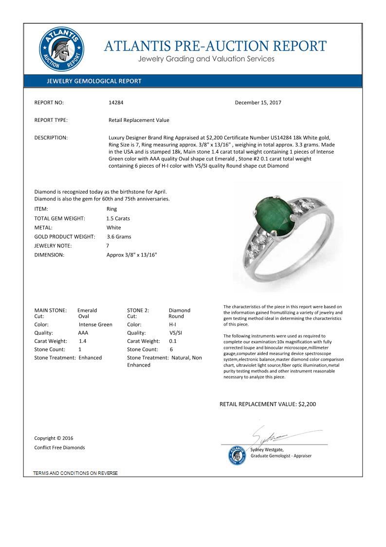 REF-33H5A -14284 ---- 1.50 CTW Emerald & Diamond Ring 18K White Gold ---- Luxury Designer Brand Ring Appraised at $2,200 Certificate Number US14284 18k White gold, Ring Size is 7, Ring measuring approx. 3/8" x 13/16" , weighing in total approx. 3.3 grams. Made in the USA and is stamped 18k, Main stone 1.4 carat total weight containing 1 pieces of Intense Green color with AAA quality Oval shape cut Emerald , Stone #2 0.1 carat total weight containing 6 pieces of H-I color with VS/SI quality Round shape cut Diamond