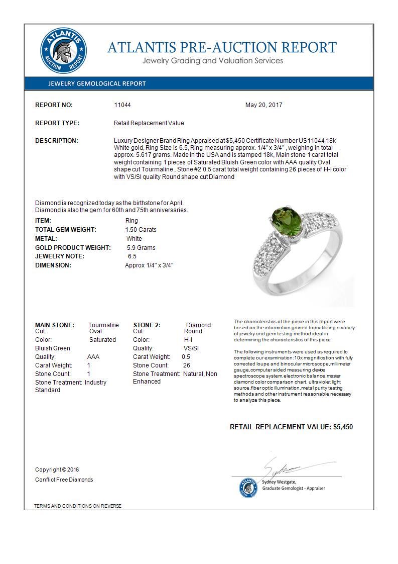 1.50 CTW Green Tourmaline & Diamond Ring 18K White Gold ---- Luxury Designer Brand Ring Appraised Retail Price at $5,450 ---- SKU Number US11044 18k White gold Ring Size is 6.5, Ring measuring approx. 1/4" x 3/4" , weighing in total approx. 5.617 grams. Made in the USA and is stamped 18k, Main stone 1 carat total weight containing 1 pieces of Saturated Bluish Green color with AAA quality Oval shape cut Tourmaline , Stone #2 0.5 carat total weight containing 26 pieces of H-I color with VS/SI quality Round shape cut