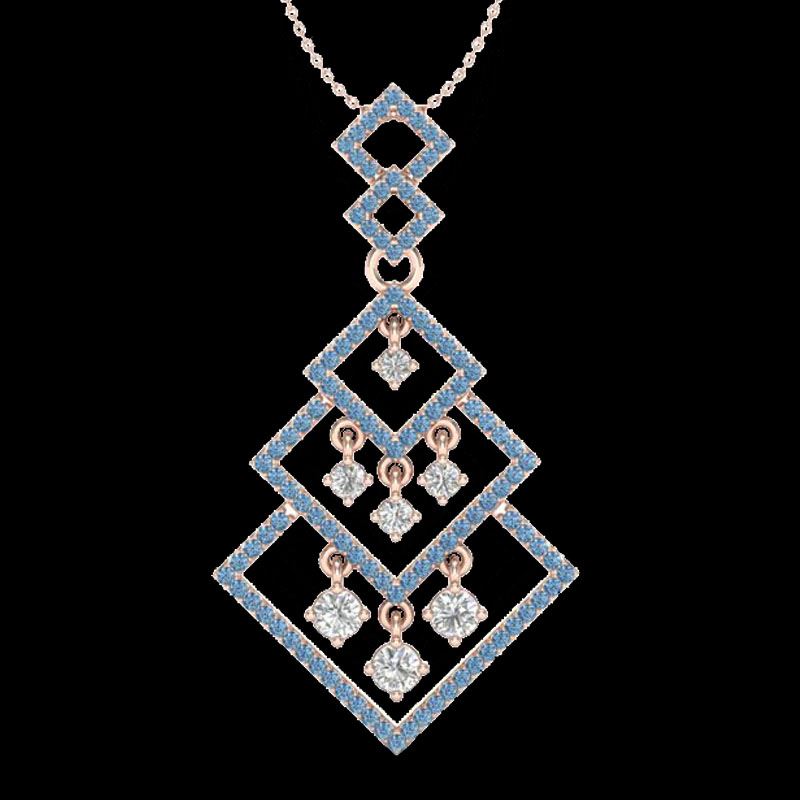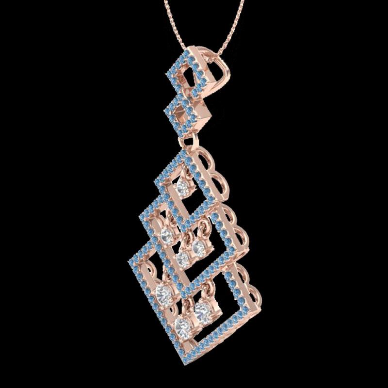 1.50 CTW Micro Blue & VS/SI Diamond Necklace Dangling Designer 14K Rose Gold ---- Luxury Designer Brand Necklace Appraised Retail Price at $9,300 ---- SKU Number US22492 14k Rose gold Necklace Size is 16 Inches, Necklace measuring approx. 1 3/4" x 1" , weighing in total approx. 7.4 grams. Made in the USA and is stamped 14k, Main stone 0.75 carat total weight containing 91 pieces of Intense Fancy Blue color with SI quality Round shape cut Diamond , Stone #2 0.75 carat total weight containing 7 pieces of H-I color with VS/SI quality Round shape cut