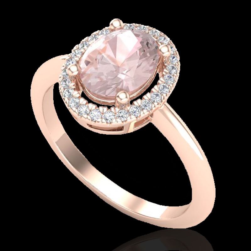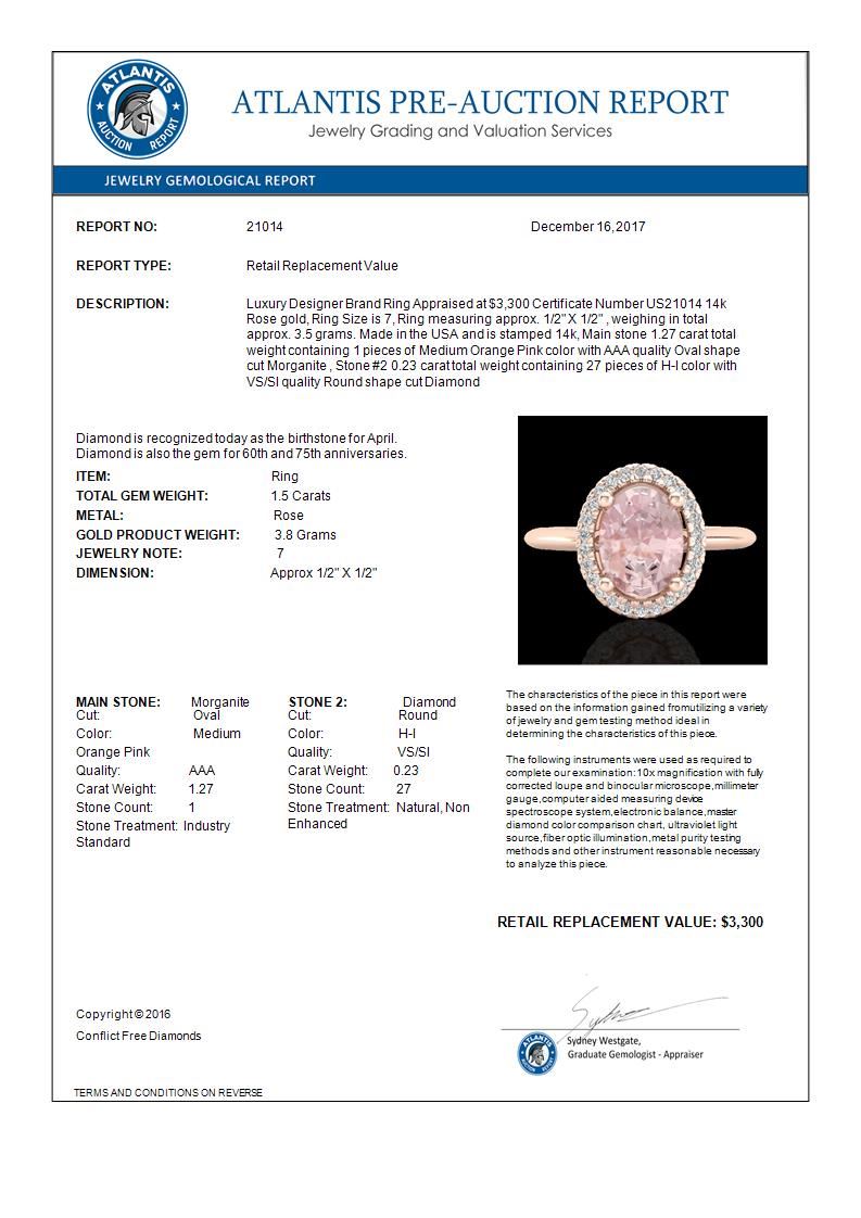 REF-50T4M -21014 ---- 1.50 CTW Morganite & Micro VS/SI Diamond Ring Solitaire Halo 14K Rose Gold ---- Luxury Designer Brand Ring Appraised at $3,300 Certificate Number US21014 14k Rose gold, Ring Size is 7, Ring measuring approx. 1/2" X 1/2" , weighing in total approx. 3.5 grams. Made in the USA and is stamped 14k, Main stone 1.27 carat total weight containing 1 pieces of Medium Orange Pink color with AAA quality Oval shape cut Morganite , Stone #2 0.23 carat total weight containing 27 pieces of H-I color with VS/SI quality Round shape cut Diamond