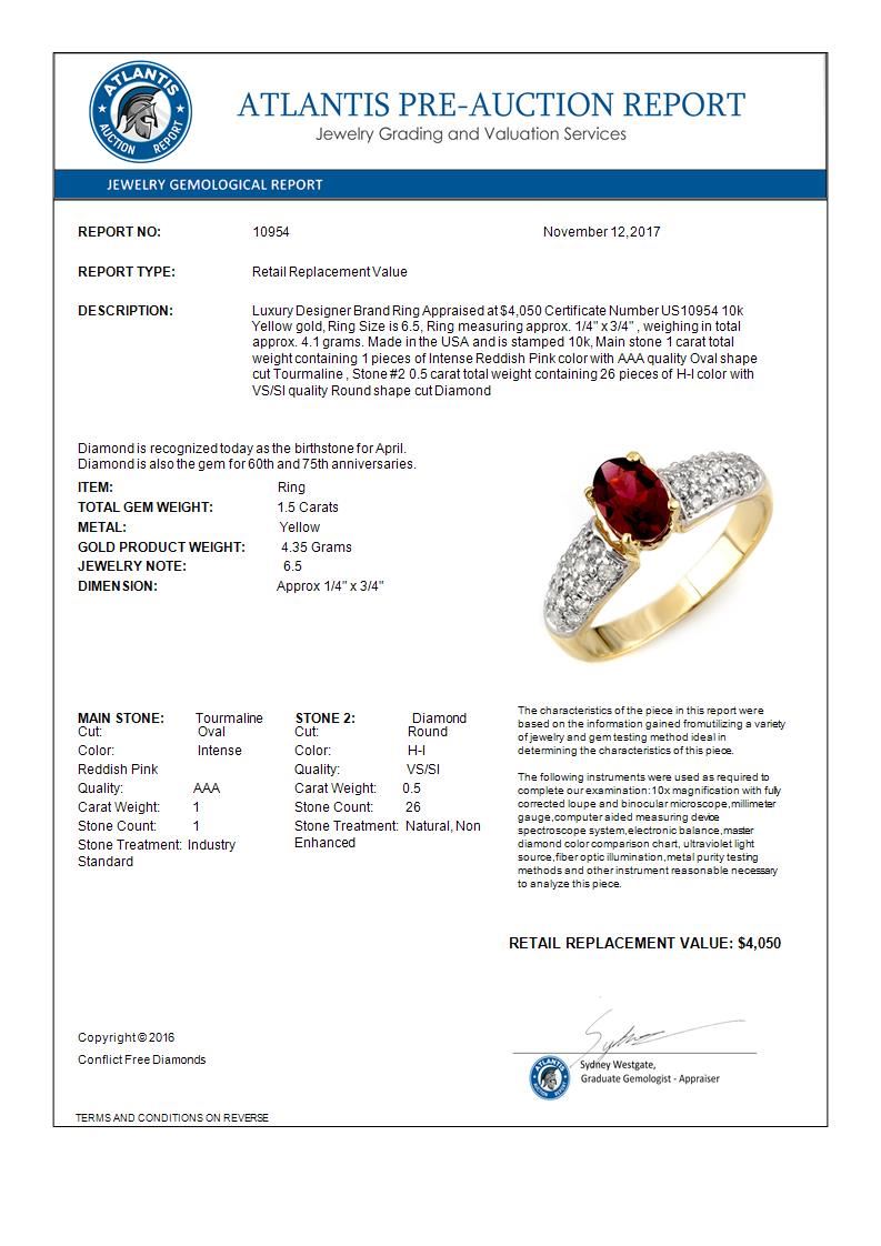 REF-52W8F -10954 ---- 1.50 CTW Pink Tourmaline & Diamond Ring 10K Yellow Gold ---- Luxury Designer Brand Ring Appraised at $4,050 Certificate Number US10954 10k Yellow gold, Ring Size is 6.5, Ring measuring approx. 1/4" x 3/4" , weighing in total approx. 4.1 grams. Made in the USA and is stamped 10k, Main stone 1 carat total weight containing 1 pieces of Intense Reddish Pink color with AAA quality Oval shape cut Tourmaline , Stone #2 0.5 carat total weight containing 26 pieces of H-I color with VS/SI quality Round shape cut Diamond