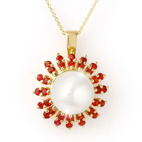 1.50 CTW Red Sapphire & Pearl Necklace 10K Yellow Gold ---- Luxury Designer Brand Necklace Appraised Retail Price at $2,850 ---- SKU Number US11741 10k Yellow gold Necklace Size is 16 Incehs, Necklace measuring approx. 3/4" x 3/4", weighing in total approx. 4.3 grams. Made in the USA and is stamped 10k, Main stone 1.5 carat total weight containing 32 pieces of Translucent Intense Red color with AAA quality Round shape cut Sapphire , Stone #2 carat total weight containing pieces of color with quality shape cut