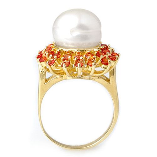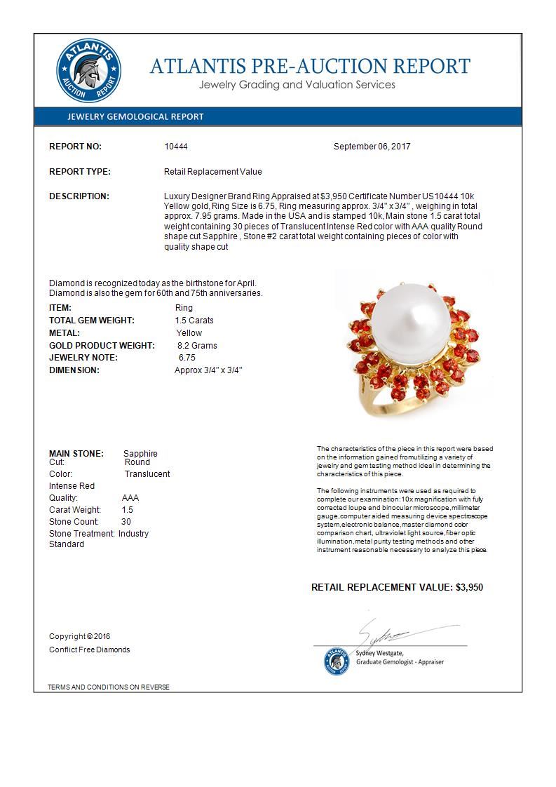 10444 - REF-54K9W ---- 1.50 CTW Red Sapphire & Pearl Ring 10K Yellow Gold ---- Luxury Designer Brand Ring Appraised at $3,950 Certificate Number US10444 10k Yellow gold, Ring Size is 6.75, Ring measuring approx. 3/4" x 3/4" , weighing in total approx. 7.95 grams. Made in the USA and is stamped 10k, Main stone 1.5 carat total weight containing 30 pieces of Translucent Intense Red color with AAA quality Round shape cut Sapphire , Stone #2 carat total weight containing pieces of color with quality shape cut