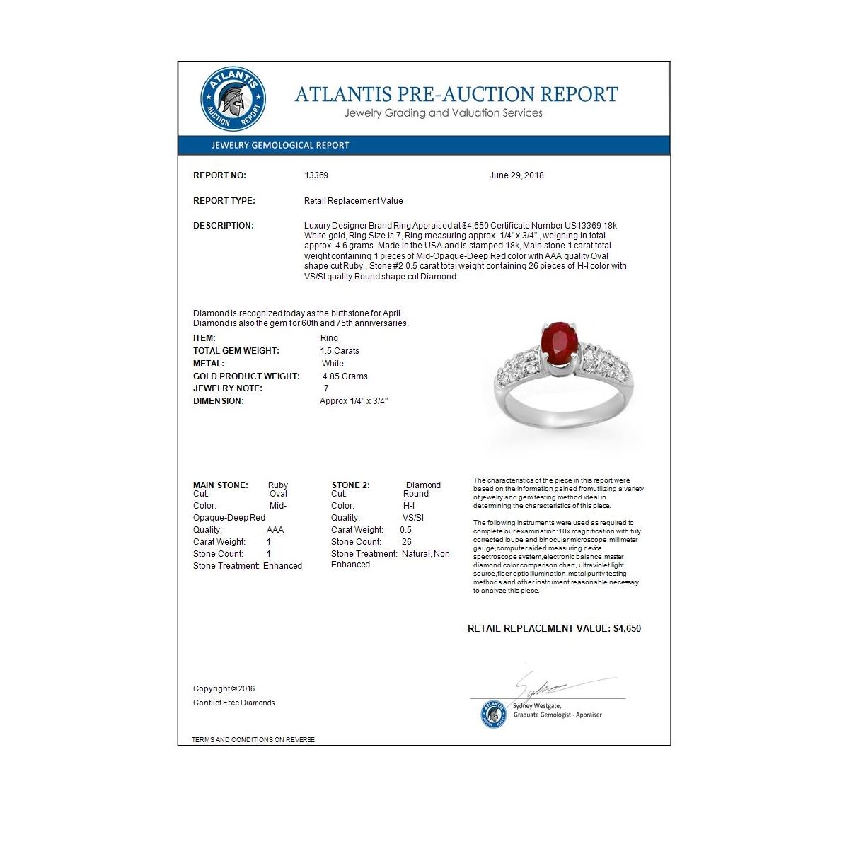 REF-64X9T -13369 ---- 1.50 CTW Ruby & Diamond Ring 18K White Gold ---- Luxury Designer Brand Ring Appraised at $4,650 Certificate Number US13369 18k White gold, Ring Size is 7, Ring measuring approx. 1/4" x 3/4" , weighing in total approx. 4.6 grams. Made in the USA and is stamped 18k, Main stone 1 carat total weight containing 1 pieces of Mid-Opaque-Deep Red color with AAA quality Oval shape cut Ruby , Stone #2 0.5 carat total weight containing 26 pieces of H-I color with VS/SI quality Round shape cut Diamond