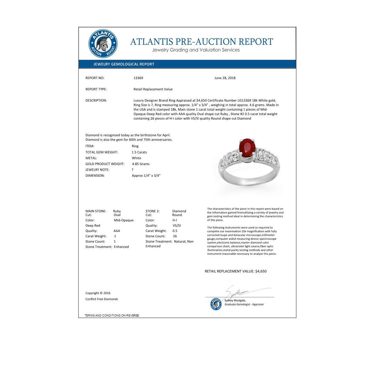REF-64X9T -13369 ---- 1.50 CTW Ruby & Diamond Ring 18K White Gold ---- Luxury Designer Brand Ring Appraised at $4,650 Certificate Number US13369 18k White gold, Ring Size is 7, Ring measuring approx. 1/4" x 3/4" , weighing in total approx. 4.6 grams. Made in the USA and is stamped 18k, Main stone 1 carat total weight containing 1 pieces of Mid-Opaque-Deep Red color with AAA quality Oval shape cut Ruby , Stone #2 0.5 carat total weight containing 26 pieces of H-I color with VS/SI quality Round shape cut Diamond