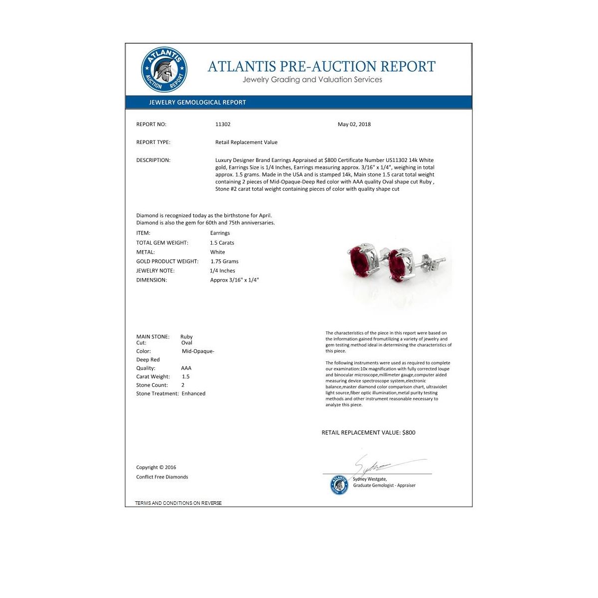 REF-12W2F -11302 ---- 1.50 CTW Ruby Earrings 14K White Gold ---- Luxury Designer Brand Earrings Appraised at $800 Certificate Number US11302 14k White gold, Earrings Size is 1/4 Inches, Earrings measuring approx. 3/16" x 1/4", weighing in total approx. 1.5 grams. Made in the USA and is stamped 14k, Main stone 1.5 carat total weight containing 2 pieces of Mid-Opaque-Deep Red color with AAA quality Oval shape cut Ruby , Stone #2 carat total weight containing pieces of color with quality shape cut