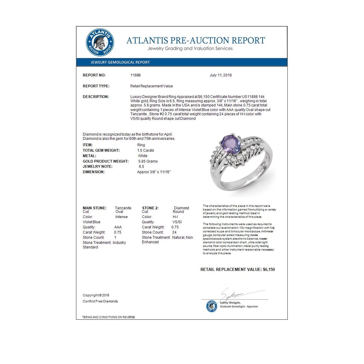 REF-80W2F -11886 ---- 1.50 CTW Tanzanite & Diamond Ring 14K White Gold ---- Luxury Designer Brand Ring Appraised at $6,150 Certificate Number US11886 14k White gold, Ring Size is 6.5, Ring measuring approx. 3/8" x 11/16" , weighing in total approx. 5.6 grams. Made in the USA and is stamped 14k, Main stone 0.75 carat total weight containing 1 pieces of Intense Violet Blue color with AAA quality Oval shape cut Tanzanite , Stone #2 0.75 carat total weight containing 24 pieces of H-I color with VS/SI quality Round shape cut Diamond