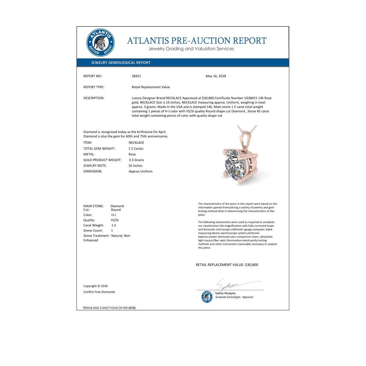 REF-513X3T -38421 ---- 1.50 CTW VS/SI Diamond Designer Necklace 14K Rose Gold ---- Luxury Designer Brand NECKLACE Appraised at $30,800 Certificate Number US38421 14k Rose gold, NECKLACE Size is 16 Inches, NECKLACE measuring approx. Uniform, weighing in total approx. 3 grams. Made in the USA and is stamped 14k, Main stone 1.5 carat total weight containing 1 pieces of H-J color with VS/SI quality Round shape cut Diamond , Stone #2 carat total weight containing pieces of color with quality shape cut