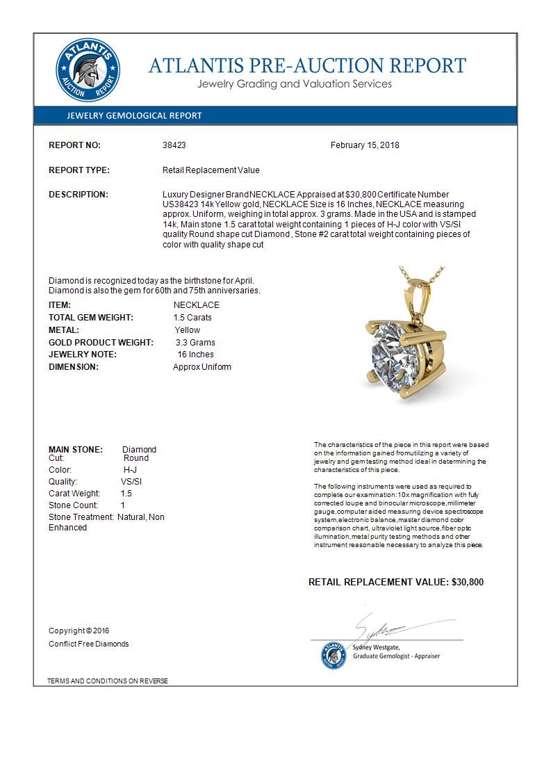 REF-513H3A -38423 ---- 1.50 CTW VS/SI Diamond Designer Necklace 14K Yellow Gold ---- Luxury Designer Brand NECKLACE Appraised at $30,800 Certificate Number US38423 14k Yellow gold, NECKLACE Size is 16 Inches, NECKLACE measuring approx. Uniform, weighing in total approx. 3 grams. Made in the USA and is stamped 14k, Main stone 1.5 carat total weight containing 1 pieces of H-J color with VS/SI quality Round shape cut Diamond , Stone #2 carat total weight containing pieces of color with quality shape cut