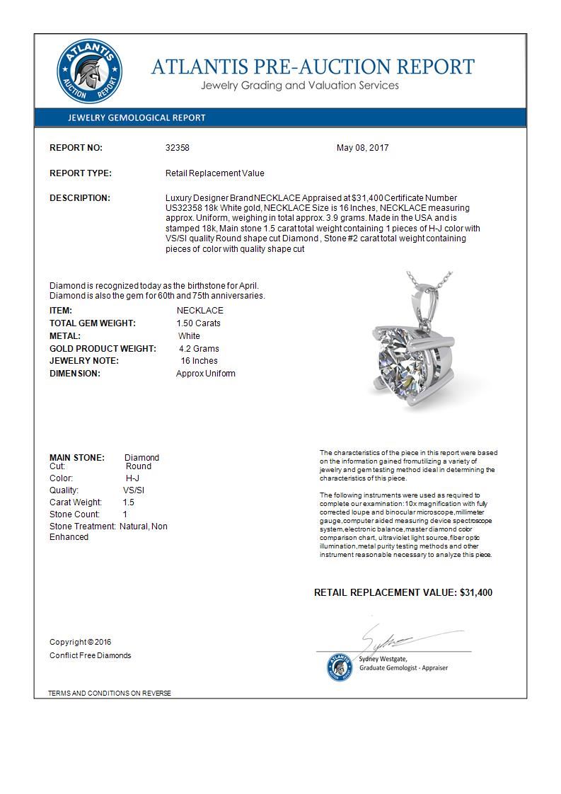 1.50 CTW VS/SI Diamond Designer Necklace 18K White Gold ---- Luxury Designer Brand NECKLACE Appraised Retail Price at $31,400 ---- SKU Number US32358 18k White gold NECKLACE Size is 16 Inches, NECKLACE measuring approx. Uniform, weighing in total approx. 3.9 grams. Made in the USA and is stamped 18k, Main stone 1.5 carat total weight containing 1 pieces of H-J color with VS/SI quality Round shape cut Diamond , Stone #2 carat total weight containing pieces of color with quality shape cut