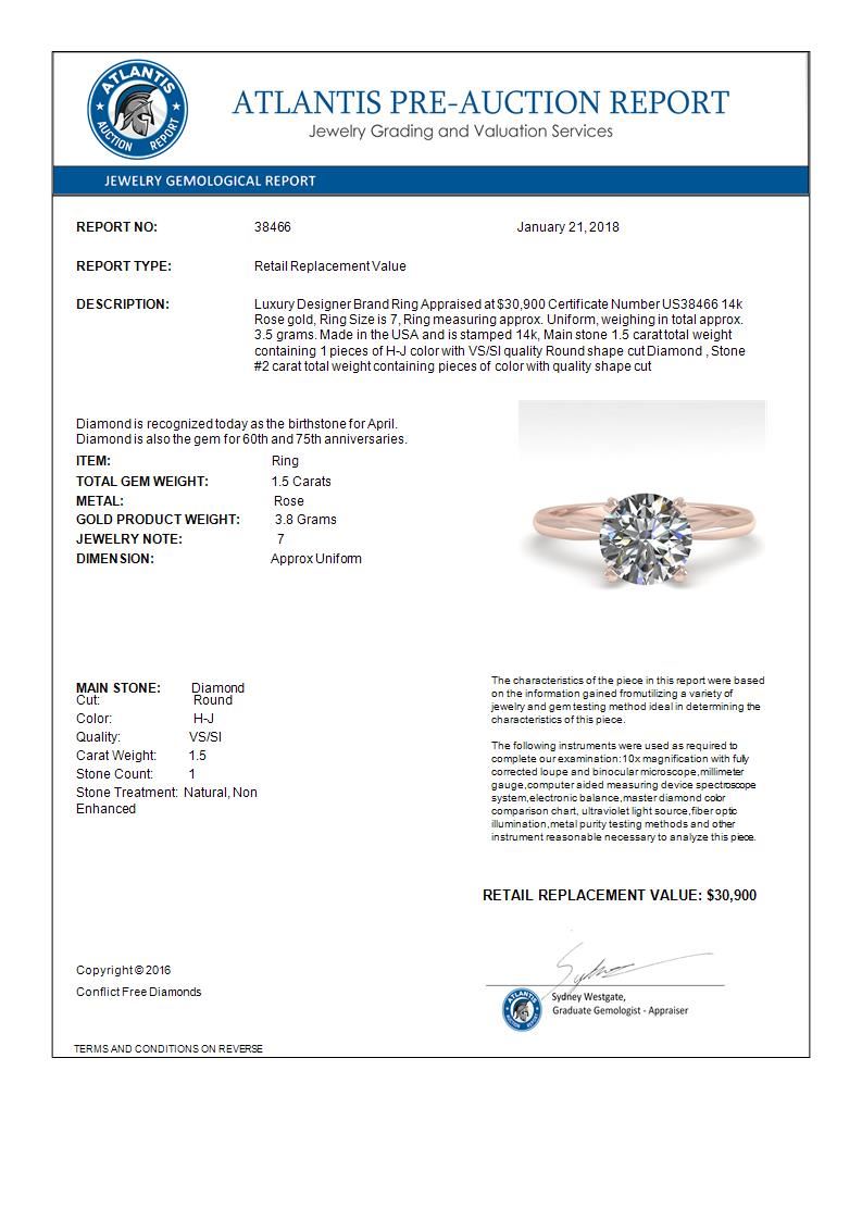 REF-514W8F -38466 ---- 1.50 CTW VS/SI Diamond Engagement Designer Ring 14K Rose Gold ---- Luxury Designer Brand Ring Appraised at $30,900 Certificate Number US38466 14k Rose gold, Ring Size is 7, Ring measuring approx. Uniform, weighing in total approx. 3.5 grams. Made in the USA and is stamped 14k, Main stone 1.5 carat total weight containing 1 pieces of H-J color with VS/SI quality Round shape cut Diamond , Stone #2 carat total weight containing pieces of color with quality shape cut