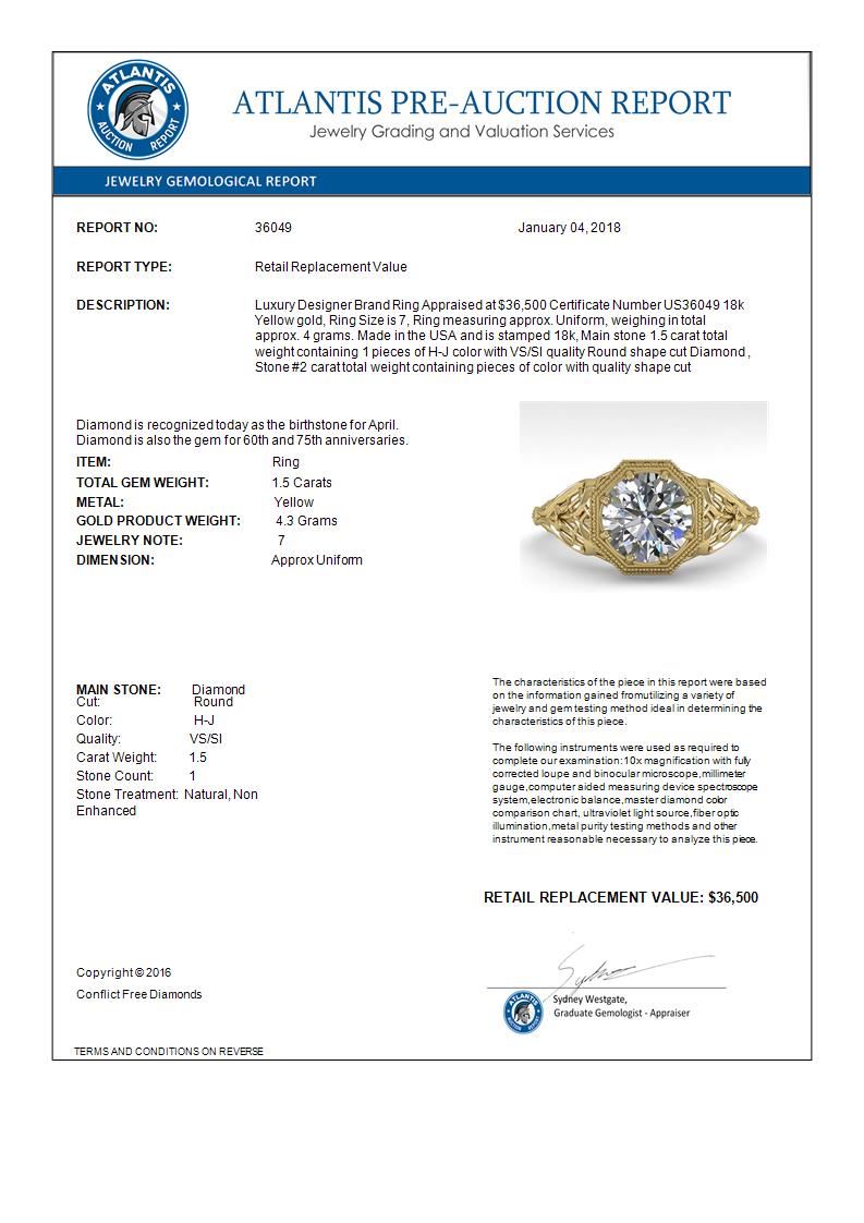 REF-547A6X -36049 ---- 1.50 CTW VS/SI Diamond Solitaire Engagement Ring 18K Yellow Gold ---- Luxury Designer Brand Ring Appraised at $36,500 Certificate Number US36049 18k Yellow gold, Ring Size is 7, Ring measuring approx. Uniform, weighing in total approx. 4 grams. Made in the USA and is stamped 18k, Main stone 1.5 carat total weight containing 1 pieces of H-J color with VS/SI quality Round shape cut Diamond , Stone #2 carat total weight containing pieces of color with quality shape cut