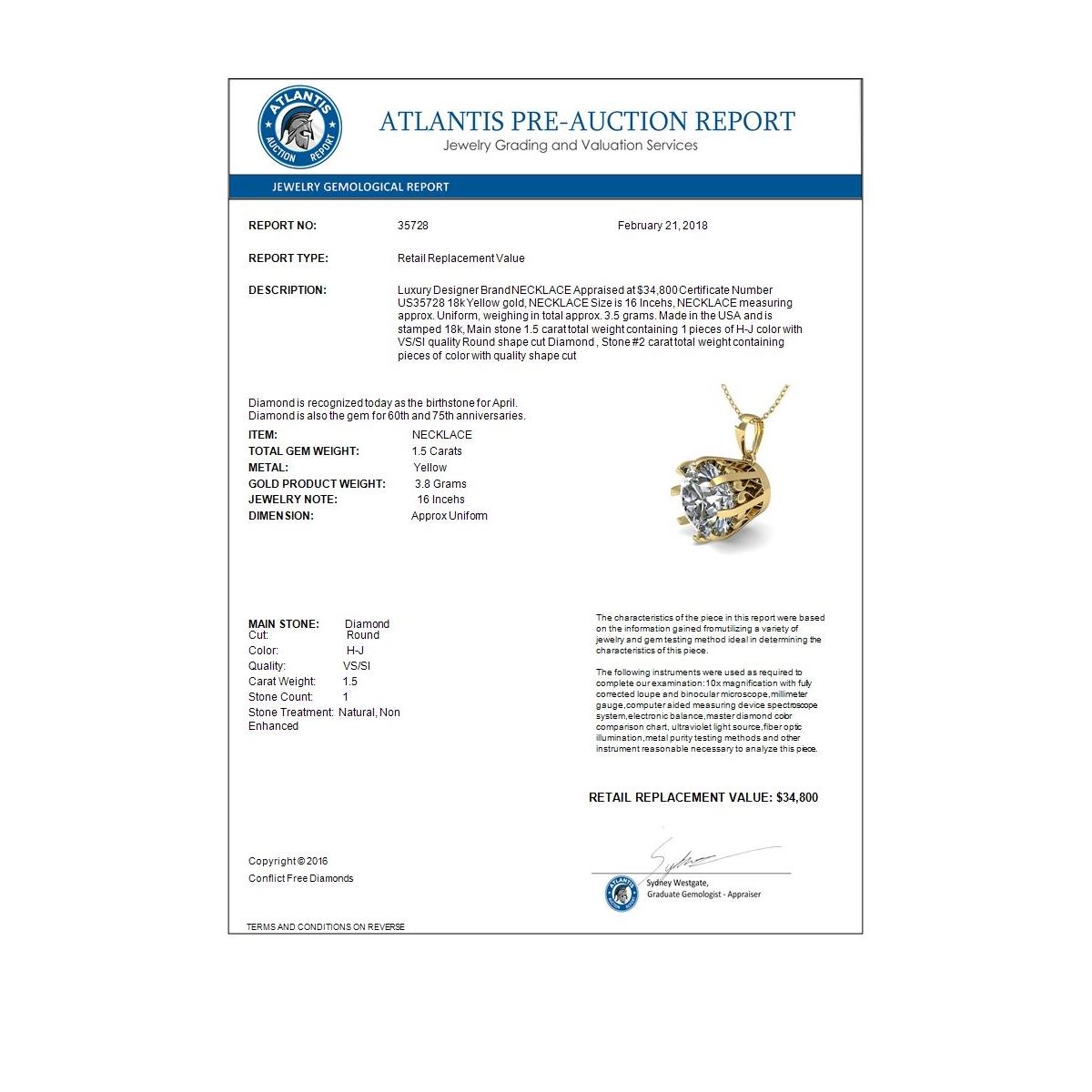 REF-522W2F -35728 ---- 1.50 CTW VS/SI Diamond Solitaire Necklace 18K Yellow Gold ---- Luxury Designer Brand NECKLACE Appraised at $34,800 Certificate Number US35728 18k Yellow gold, NECKLACE Size is 16 Incehs, NECKLACE measuring approx. Uniform, weighing in total approx. 3.5 grams. Made in the USA and is stamped 18k, Main stone 1.5 carat total weight containing 1 pieces of H-J color with VS/SI quality Round shape cut Diamond , Stone #2 carat total weight containing pieces of color with quality shape cut
