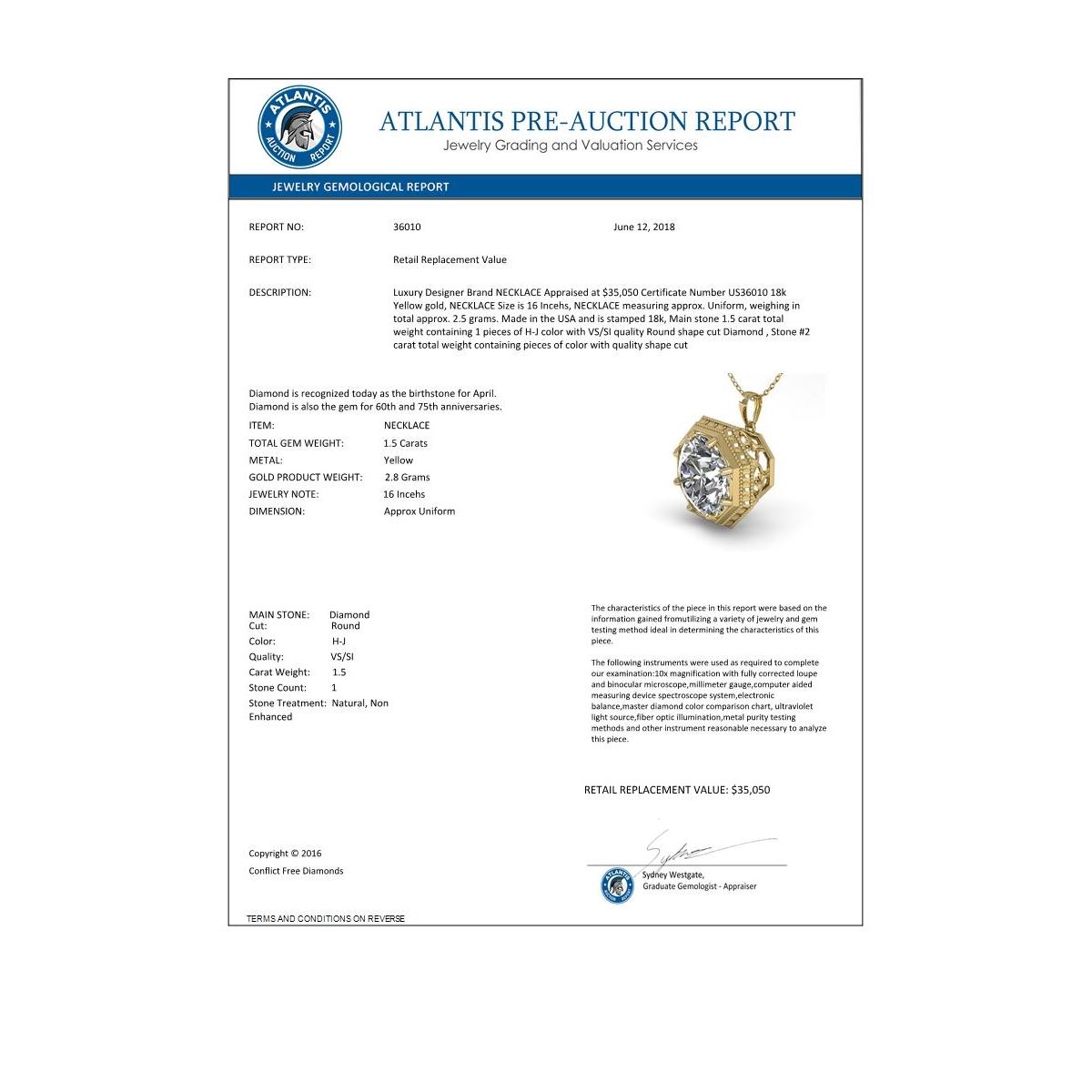 REF-525Y6K -36010 ---- 1.50 CTW VS/SI Diamond Solitaire Necklace 18K Yellow Gold ---- Luxury Designer Brand NECKLACE Appraised at $35,050 Certificate Number US36010 18k Yellow gold, NECKLACE Size is 16 Incehs, NECKLACE measuring approx. Uniform, weighing in total approx. 2.5 grams. Made in the USA and is stamped 18k, Main stone 1.5 carat total weight containing 1 pieces of H-J color with VS/SI quality Round shape cut Diamond , Stone #2 carat total weight containing pieces of color with quality shape cut