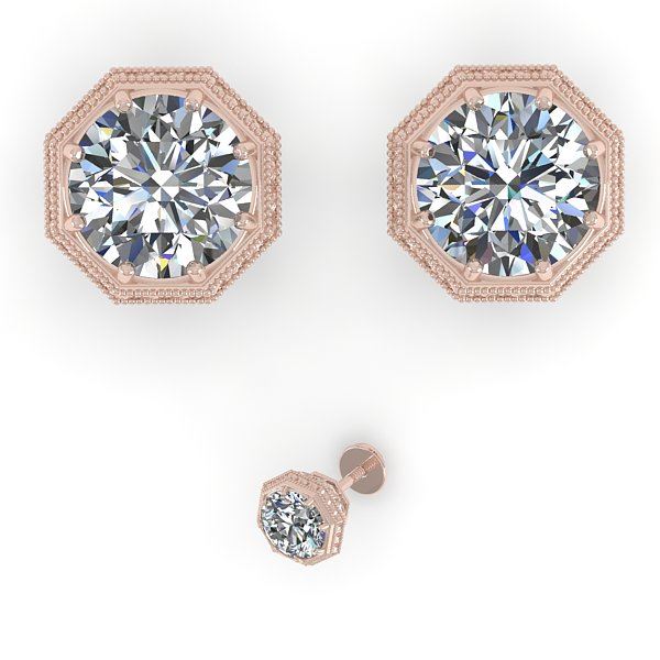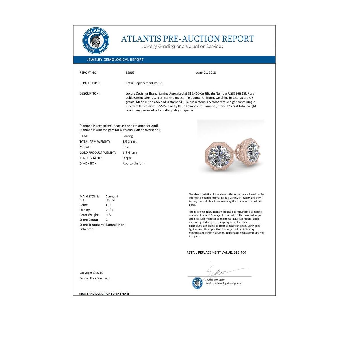 REF-311T3M -35966 ---- 1.50 CTW VS/SI Diamond Stud Solitaire Earrings 18K Rose Gold ---- Luxury Designer Brand Earring Appraised at $15,400 Certificate Number US35966 18k Rose gold, Earring Size is Larger, Earring measuring approx. Uniform, weighing in total approx. 3 grams. Made in the USA and is stamped 18k, Main stone 1.5 carat total weight containing 2 pieces of H-J color with VS/SI quality Round shape cut Diamond , Stone #2 carat total weight containing pieces of color with quality shape cut