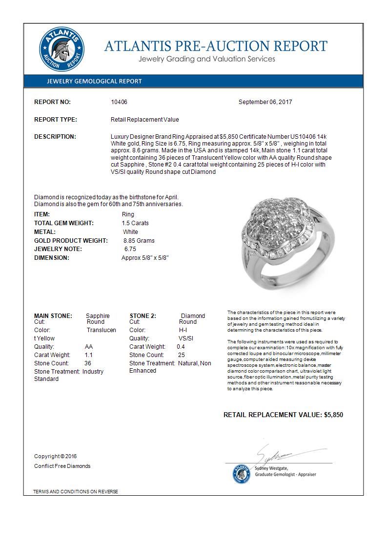10406 - REF-81M8F ---- 1.50 CTW Yellow Sapphire & Diamond Ring 14K White Gold ---- Luxury Designer Brand Ring Appraised at $5,850 Certificate Number US10406 14k White gold, Ring Size is 6.75, Ring measuring approx. 5/8" x 5/8" , weighing in total approx. 8.6 grams. Made in the USA and is stamped 14k, Main stone 1.1 carat total weight containing 36 pieces of Translucent Yellow color with AA quality Round shape cut Sapphire , Stone #2 0.4 carat total weight containing 25 pieces of H-I color with VS/SI quality Round shape cut Diamond