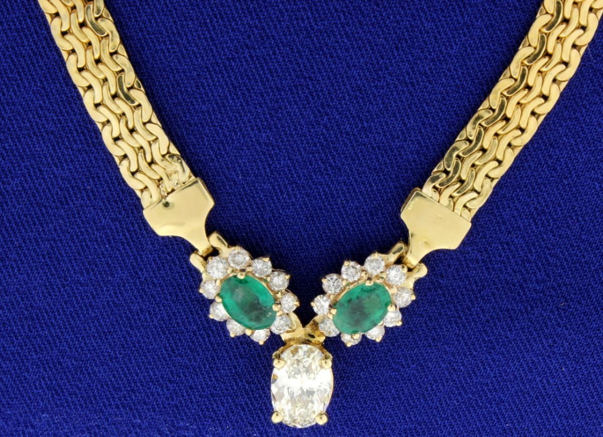 The large oval main diamond measures 9.58mmx6.42mm with a weight of 1.50 carats, clarity SI1-VS2, color K. There are 2 oval 1 carat size 7mmx5mm emeralds of very nice quality in a beautiful green color. There is a "halo" around each emerald with 10 brilliant cut diamonds (total diamond weight 1.00 carat, SI clarity, H-I color). The 14k chain is 5.5mm wide. 18g