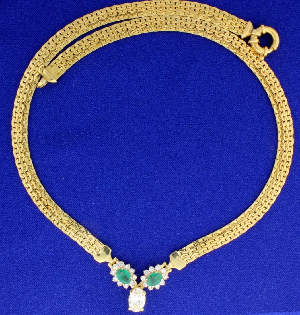 The large oval main diamond measures 9.58mmx6.42mm with a weight of 1.50 carats, clarity SI1-VS2, color K. There are 2 oval 1 carat size 7mmx5mm emeralds of very nice quality in a beautiful green color. There is a "halo" around each emerald with 10 brilliant cut diamonds (total diamond weight 1.00 carat, SI clarity, H-I color). The 14k chain is 5.5mm wide. 18g